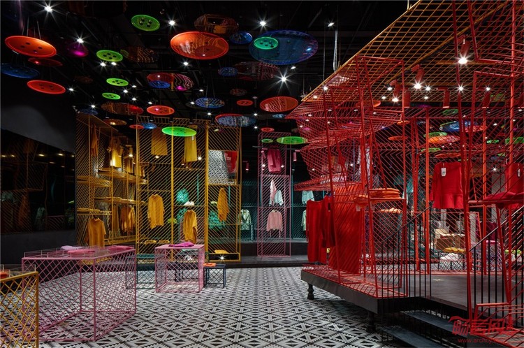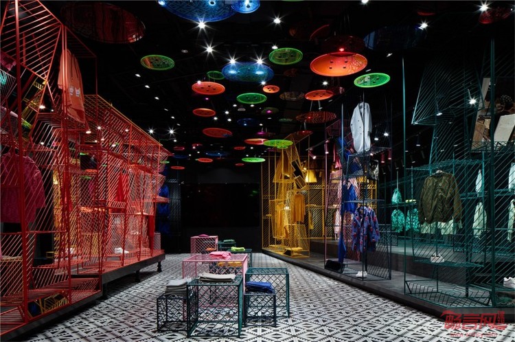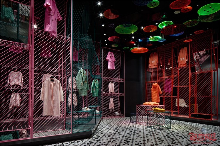 潮女区大色块的撞色,由一根根铁艺曲折而成的彩色货架,在这个强调个性的空间,利用衣架的前后折度来分割成双面挂衣的结构,彩色与折线的拼织来打造幻彩个性的空间以呼应该空间里服装展现的个性。