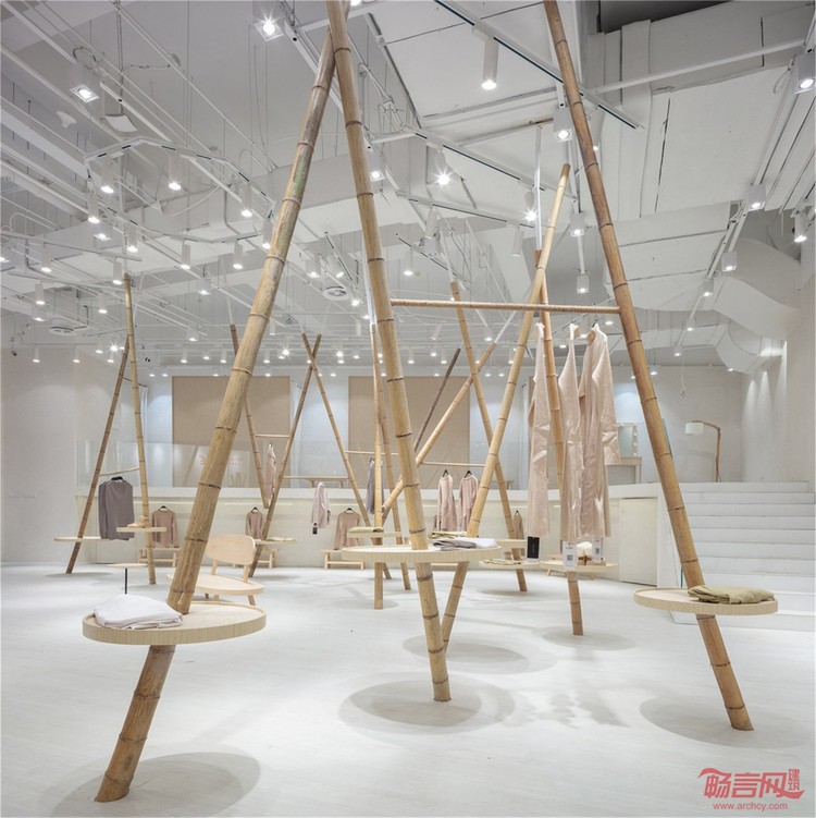 通过主入口区大大的门拱,进入到森女区。乳白色肌理墙面,白色地面,一个洁白干净的空间,支立着一根根竹竿并以麻绳做连接,而衣架也就此成型。穿衣镜则隐藏在两根竹竿的夹角立面上。空间明亮简洁并用古朴的材料来呼应该空间衣服类型的气质。