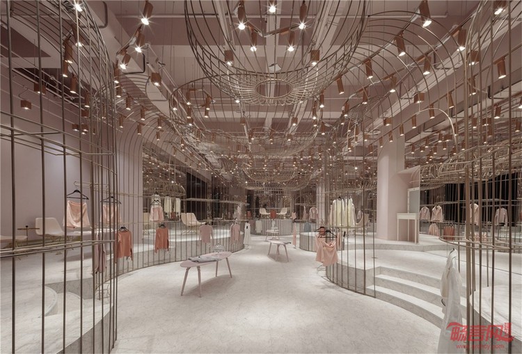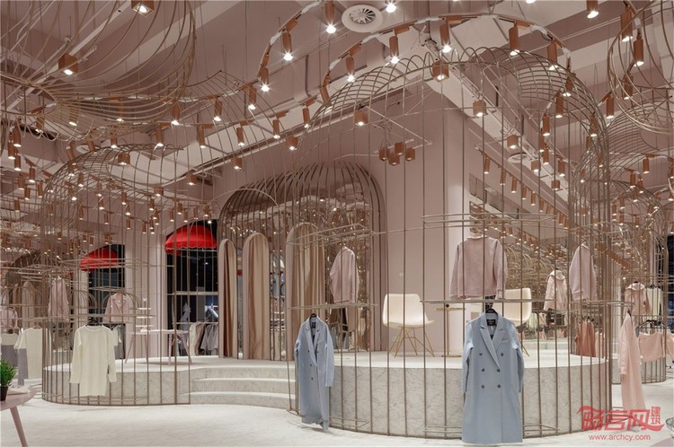 名媛区,一个个精致的金丝笼,衣架被放在金丝笼内外两侧,远看仿若被精心呵护的公主蓬蓬裙。高低起伏的弧形平台,增加趣味性的同时又不失活泼可爱。试衣间被巧妙的隐藏在弧形镜面的“蓬蓬裙”内侧。同时每个试衣间区域也提供梳妆、休憩、自拍区,等待着每一位公主。