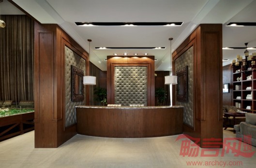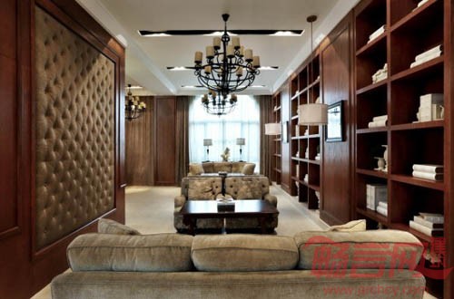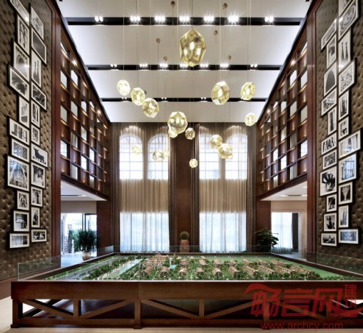大量的木饰面、仿古砖和石材的装饰是美式风格一贯的特点,暖色的橡木饰面带给人亲切自然的氛围。展厅两面对称的立面设计极富特色,中间高耸到顶的软包上,黑白挂画的构成组合,体现出独到的空间界面处理手法。沙盘上高低错落的金色吊灯把空间点亮,洽谈区舒适的的美式沙发,黑色铁艺吊灯,带着一点文化的怀旧气息。