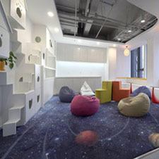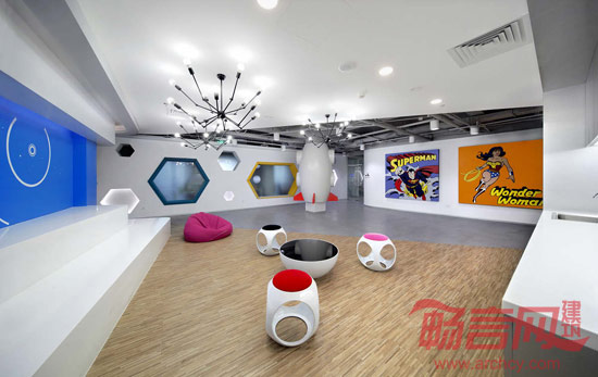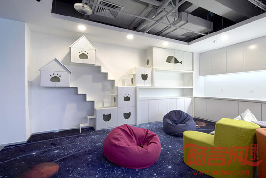 流线形的前台及背景墙体从前区一直延伸到本层里侧,将各功能区分割开来,同时又使各空间能够穿插、共享,给人以丰富的空间体验。色调以浅白色为主,局部配以星空地毯及主题墙面,传达出神秘、迷离的外星域氛围。此外,室内还配备了休闲区、瑜伽健身和胶囊公寓等功能区,为办公者使用者考虑的周全、细致。开放、轻松的办公环境氛围,最大化的激发了使用者的创造性思维。