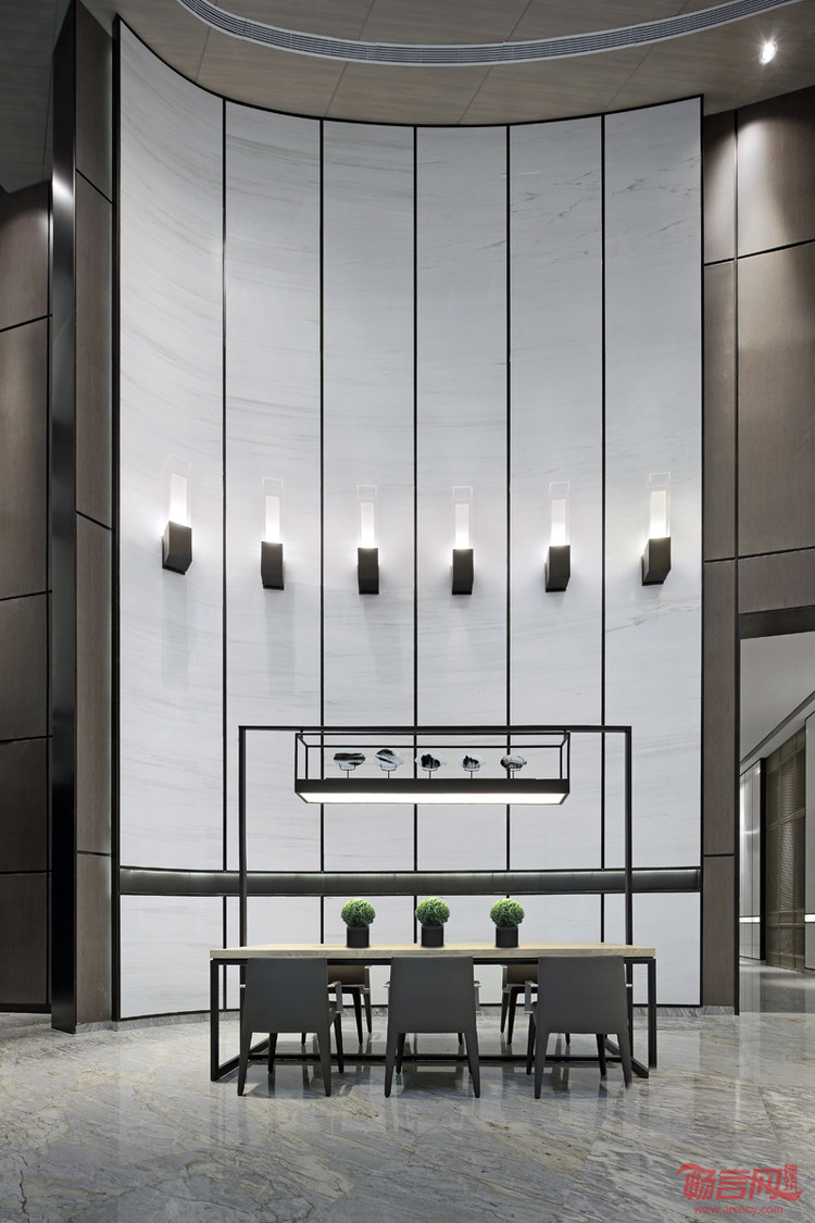 项目位于深圳大学旁,设计师以简洁而利落的售楼处设计手法,融入中国传统东方元素,通过对材料和形体的节制,去掉多余的装饰,整个空间大面积的留白,让人从而在情绪上获得安静。减少欲望,获得自由。呈现出一种自然而现代东方意境感。
