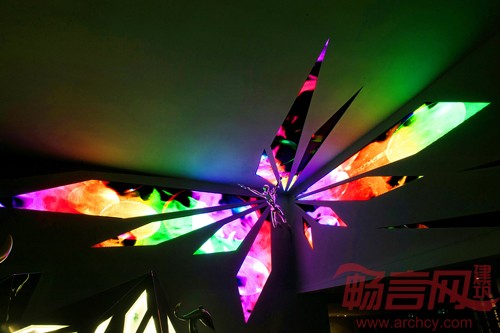 如果将前面的展区理解为人与佛的关系,那么翅头藏这里体现的则是佛之真身。设计者以一个放大的水晶作为主要造型,仿佛是古老洞穴中暗藏的巨大宝物。巨大水晶周围的上空漂浮着五个菩萨,分别为大势至菩萨、观音菩萨、普贤菩萨、地葬菩萨和文殊菩萨。设计者使用反转片效果来还原这五个菩萨的形象,寓意着菩萨的真身其实在我们世界另一面,并不一定像我们想象和在传统佛画中看到的那样。他们在空中相互交流,窃窃私语,仿佛谈论着翅头藏将要发生的一切。