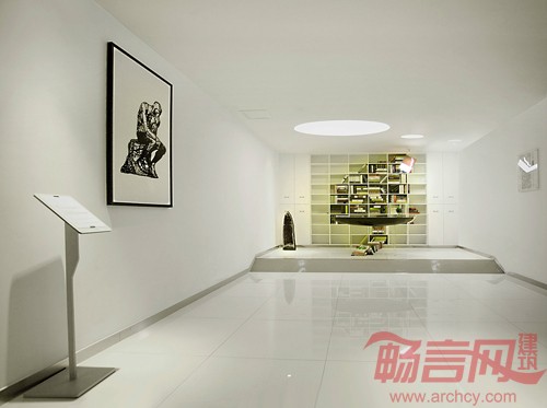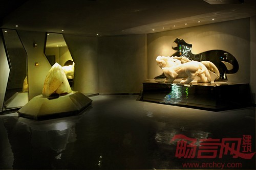 书房运用了超现实主义的视觉双关语设计手法:有形中见无形,无形中见有形,大形中见小形,小形中见大形。设计者以思考者为原型,通过书柜的图书、书桌、吊灯和台灯整合出思考者的整体造型,进而在保证基本展示内容的基础上使得整个书房更具艺术气息。此区的展品为紫水晶,具有开发智力,帮助思考,集中注意力,增强记忆力,促进脑细胞活动的功效,非常适合放置于书房。