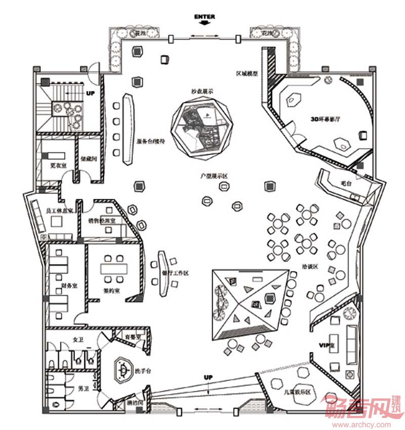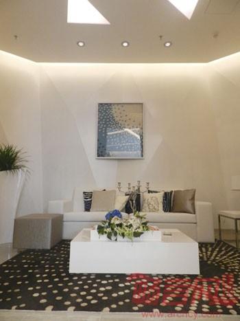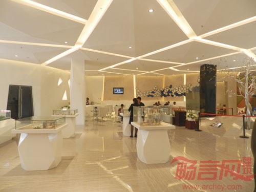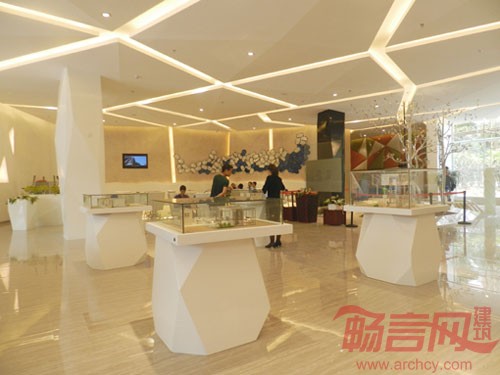 于是我们通过钻石的这个独特的性质,将整个营销中心的空间布局进行块面切割和合并重组并运用了最新的3D成象科技产品作为营销工具,从而打造了一个极具现代感和科技感的营销中心。