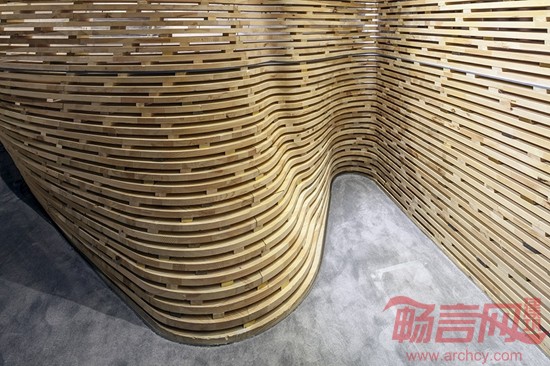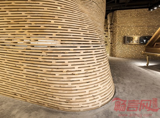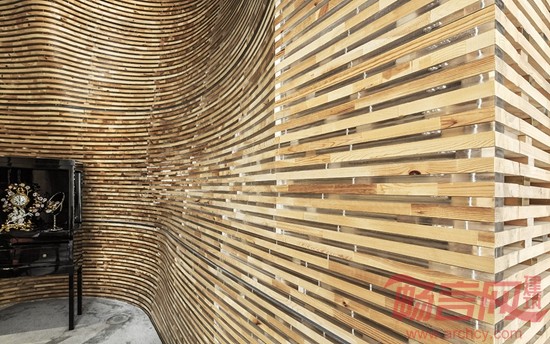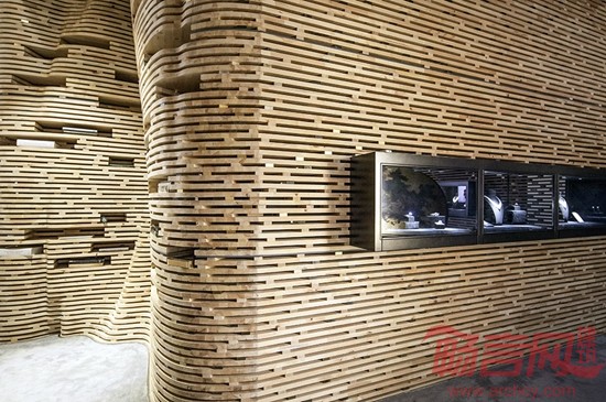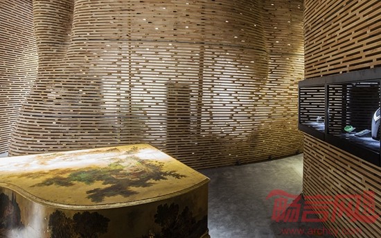 保利珠宝展厅设计旨在环境风格上表达出与众不同的自然与人文气息,从自然形态中吸取灵感,创造出时尚与先锋的艺术氛围。在空间的布局上创造性地利用连贯的非线性内衬,退让出展示与服务性空间。两种空间互为内外,里应外合,形成了一个多变的极简空间,同时满足了对自然光线和人工光源的不同需求。作品在选材上,为了营造出更具人文特色的珠宝展示效果,主体选用了纯实木为建造主体,希望将原始森林的气息带入现代都市,同时镶嵌少量的金属与透明亚克力,这不仅是构造的需要,也是与珠宝的工艺取得一种默契。
