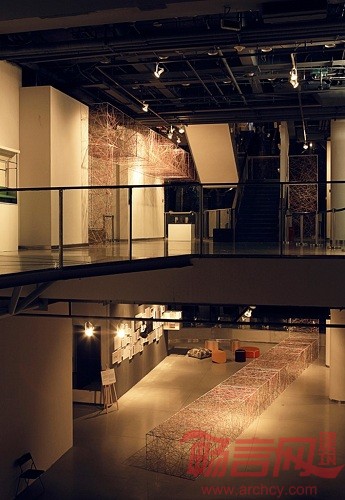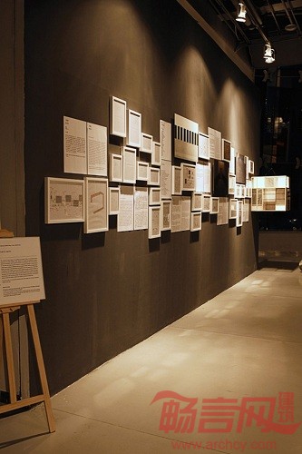展览中的工作室空间有两个内容。其一,作为整个展览的“序言”空间。首先,我们不采用通常展览前面简单文字序言的做法,而是采用设计作品的简介、草图、模型的共同呈现,以体现设计展的特点。与此同时,还结合艺术家苏畅的图像作品,试图表达一种建筑与城市、观念与现实、内部与外部之间的多重混合性。此外,因为展场二楼的放映室也是展览整体介绍的一部分,所以我们希望在一楼工作室空间和二楼放映室之间建立一种空间上的直接联系。其二,正如工作不是一件私人的事情,而必须建立在复杂的各种联系之上,因此工作室空间自身的设计概念也是“连接”。在这个基本概念之上,经过几轮设计构思,并结合经济成本、时间安排和施工制作的考量,我们确定了最终的设计。原始概念与现实条件之间的连接,也正是“设计”这一工作本身的特点。