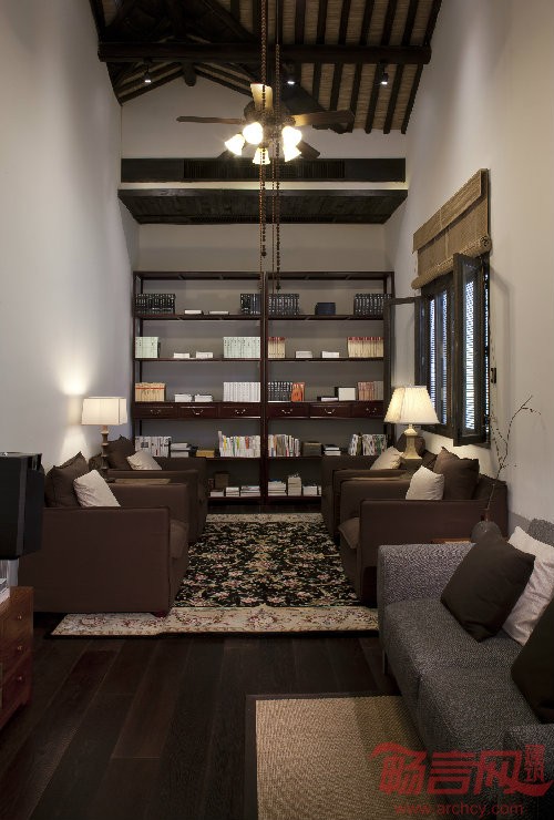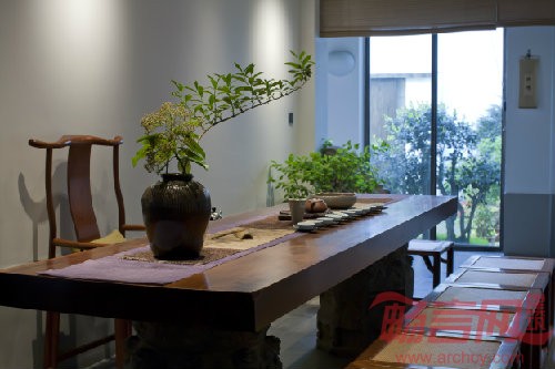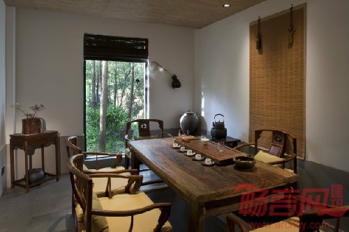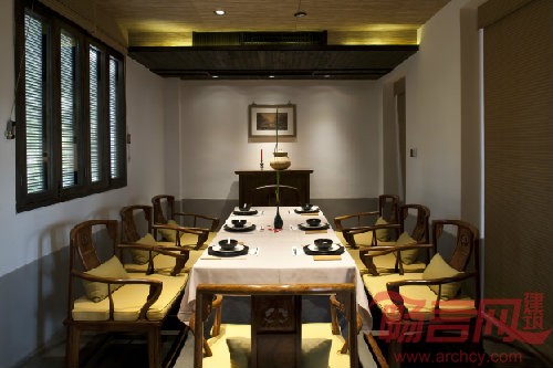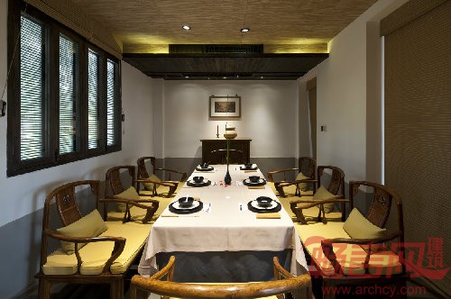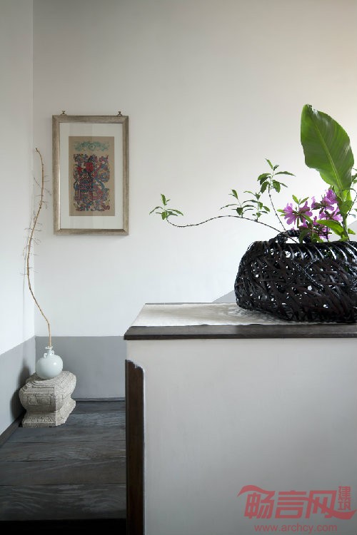 设计师用朴素淡雅作为主题,对室内空间进行了定义。采用极其普通的装饰材料,来配合粉墙黛瓦的整体风格。染色的杉木板、青砖、老的青石板、麻质地毯作为基础装修材料,来营造一个宁静的空间。在工艺细节上体现风格,辅以雅致的家具、字画与插花的软饰,充分体现主人的品味与思想意境。