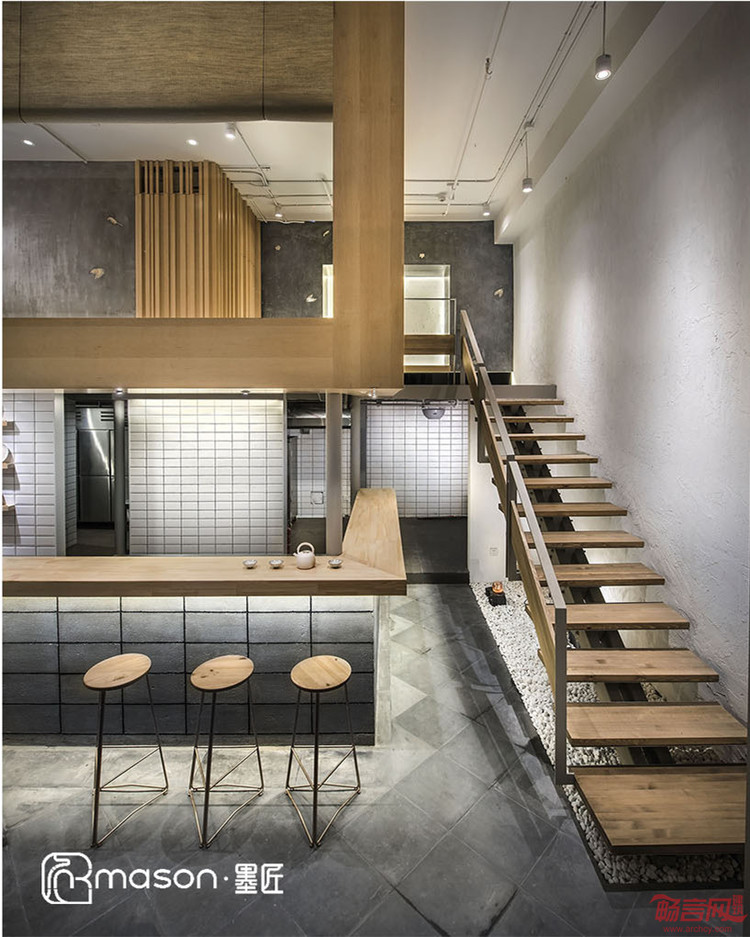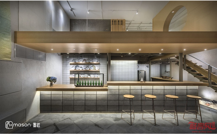 通透的外立面,让整个店的设计能见度达到最大化;拐角处玻璃与玻璃45度角的对接,让视觉充满无限的延伸。店内设计素雅简洁,彷佛从清代玉膳房穿越而来的大厨掌勺,对现代用餐设计的重新解读。青灰色地砖,其间有致地间杂刻花地砖,原木色材质长条桌把客人列成背对的两条,在小空间内保证了一定的私密。白墙与开放式厨房的白瓷砖既有呼应又有对比,并让室内的陈设与展示一览无余,干净简练。长桌下的侧光与天花顶光配合,打造了不同的层次。挑层的原木色木材与桌子呼应,简洁的线条让小空间中的挑层不感觉压抑。漏空的阶梯让视觉通透,自然地延伸到二层,底下的以白色鹅卵石铺地,并用块状山石装饰墙面,道法自然,在室内给人以成岭成峰的远山意境。