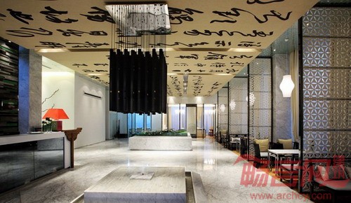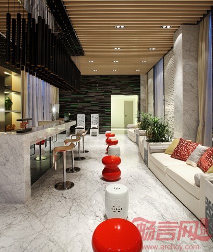 壁廊墙体以青灰色为主调,搭配着具有现代动感的艺术装饰,沉静中带着一点不羁,同时也带出一种前卫的时尚。运用色彩柔化空间的线条,表现出酒店柔美的一面。色彩鲜明的陈设与整个素雅空间形成相对比,给视觉以强烈的冲击。几方红凳打破了中间的沉闷,增强了层次感,对空间进行进一步的延伸、扩张。