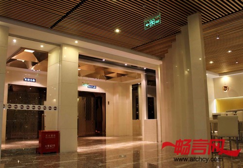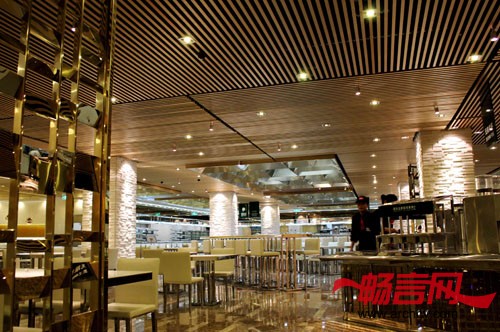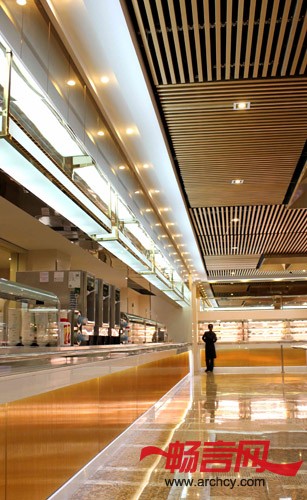 主要用材:金色铝格栅、金钻麻大理石、金色铝塑板、特殊玻璃、钛金不锈钢