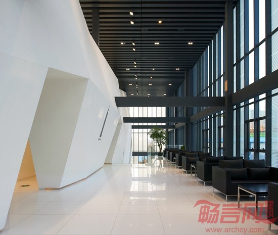 1.项目定位为高端商务销售中心,要求拥有集博物馆与专卖店于一身的展览空间。设计利用具有强烈视觉冲击力的异形墙体来增加空间展览性,满足业主需求。