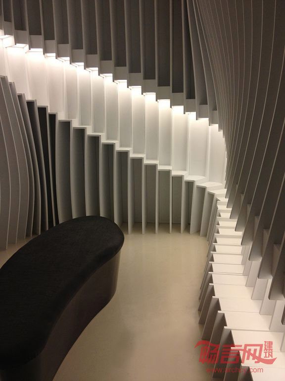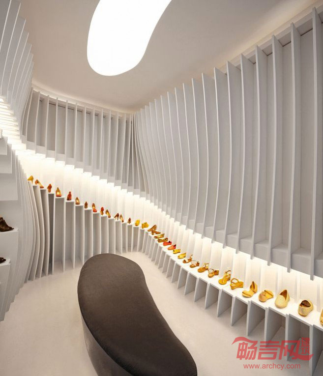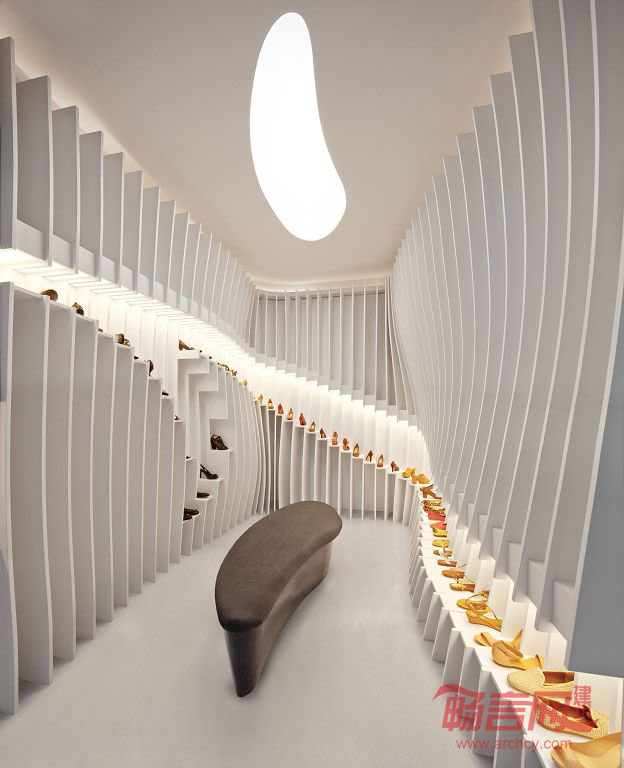 鞋架的三维形式源于女性美丽的曲线。高跟鞋代表女人的性感和优雅,用设计表达一个属于女人的空间,就是要表达女人。女人最根本的美丽源自她的母性,她孕育生命的能力。连续的曲面和展示鞋子的凹槽试图表现女人体内能够孕育生命的空间,给人带来安全和舒适感。