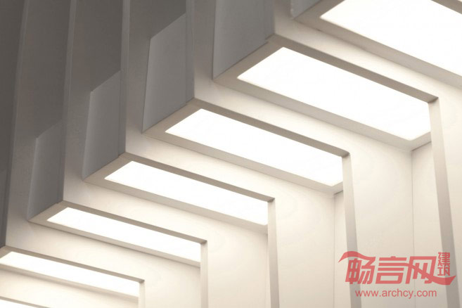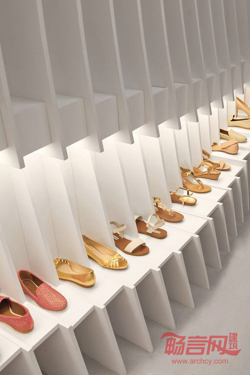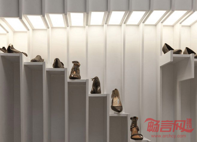 鞋店的的灯光设计没有采用常用的筒灯、射灯。灯光分了两部分,基础照明采用的是与石膏板吊顶相平的透光亚克力光盘,鞋的局部照明来自每个灯盒内一个5瓦的节能灯。鞋的储存和试鞋功能结合为一个放在中央的活动家具,兼做箱子和凳子。其形状与顶灯相呼应,与鞋架之间形成流动的顾客通道。
