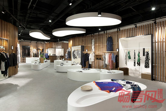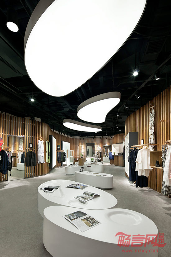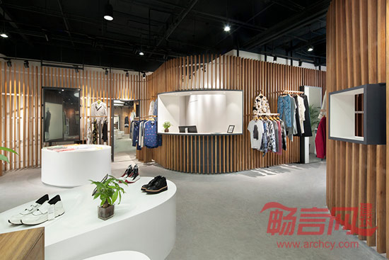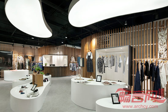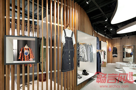 最后的结果是一片完整流畅的曲线木格栅墙体,在墙体上可以任意固定所需的展示单元,并且根据每季服装和饰品的需求不同而随时调整。