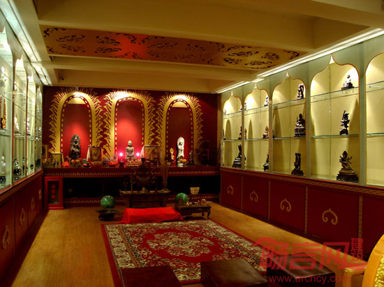 进入艺术馆,一层外凸云纹入口、老榆木的门,国学大师季羡林先生题字的馆名牌匾,无一不在诉说历史。与正门直对是佛展示空间,右转是贵宾接待室和卫生间。左转是佛堂,本案的设计也将佛教文化中的“合十”、“如意”、“祥云”、“莲花”等元素有条不紊的点播其中。