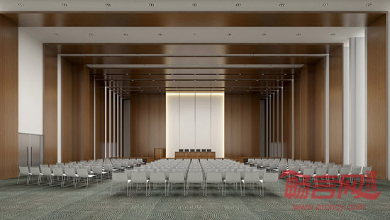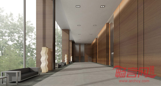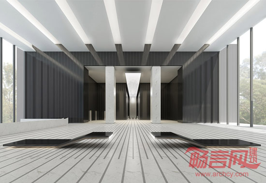 所有的设计理念都围绕着这条轴线展开。室内的材质与色调与南北座的建筑立面相呼应。自然元素在这个设计中也有所体现,如水幕与灯光的结合起来的景观,该景观与中庭广场相呼应。具有雕塑感的前台背景墙与电梯厅的天花让整个空间具有完整的象征性意义。