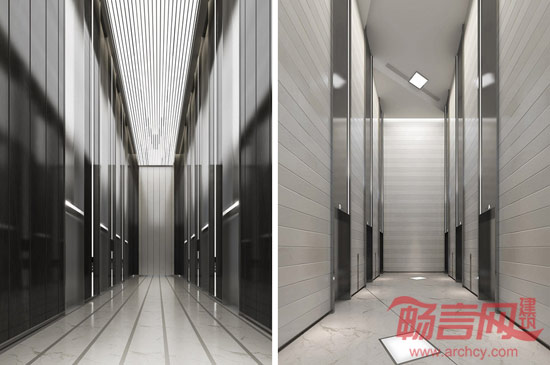 北大堂采用了随意的几何图形以呼应整个不对称的平面;而南大堂里从天花一泻而下的两个抽象的黑色瀑布,使得整个空间优雅而又令人难忘。南北大堂由下沉式广场连接且彼此对称。前台与电梯厅在同一条东西走向的中轴线上,让进入具有恢宏的仪式感。