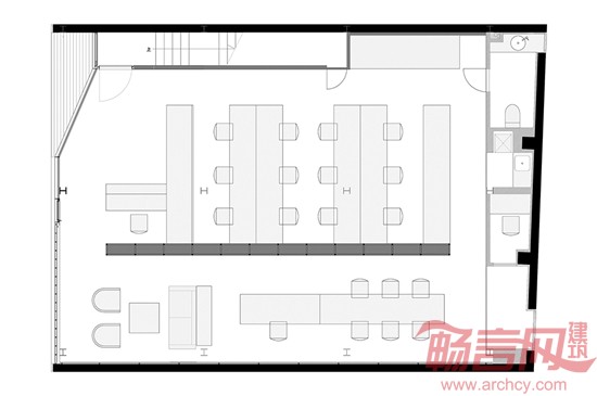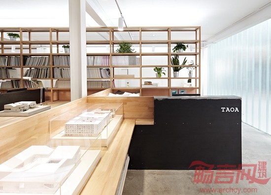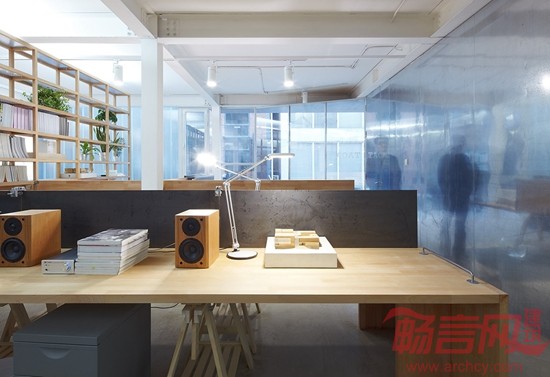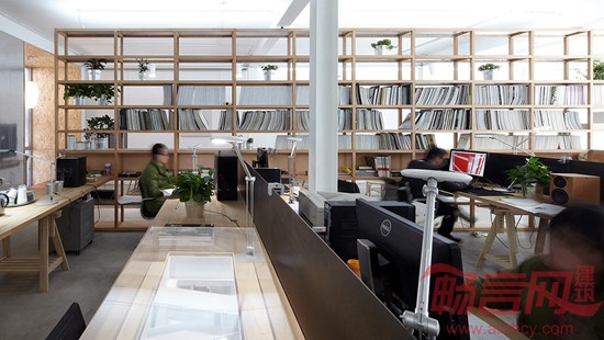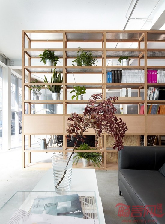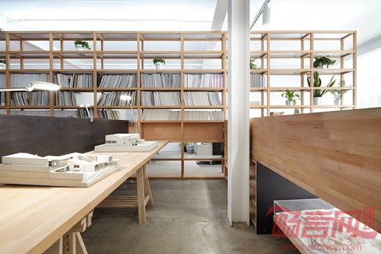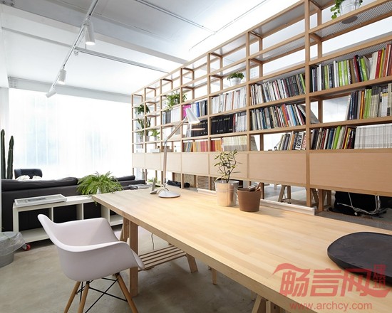 办公室被设计成一个开敞的大空间,这里没有做硬性的房间的隔断,工作区、会议区、休息及会客区等不同的功能区只是用一个巨大的实木书架作为空间的界定,通透的大书架试图将办公室营造成为自由且开放的工作空间,使其成为一个具有快乐、平等、开放工作气氛的建筑工作室。