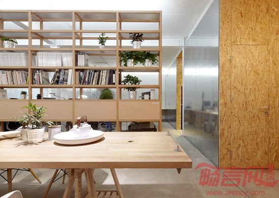 办公室内部材料采用的是最朴素的欧松板、镀锌板、白色乳胶漆、及水泥地面,室内只是配以简单的绿植,家具几乎全部是没有油漆饰面的实木,保持着实木所特有的温暖及质感,在这些没有任何修饰的材料组合中,办公室呈现了一个明亮并温暖的色调,它是一种真实可信的感受,是一种可以自信并自足的空间特质。