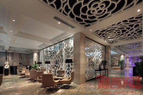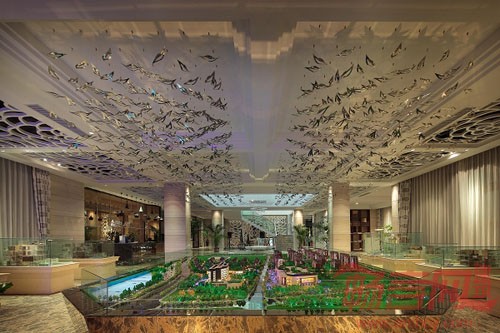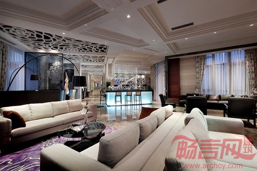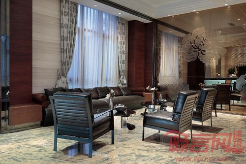 院墅顶部整体采用缓坡坡屋顶大挑檐设计,彰显浓重汉唐风韵,与纵向立面现代、简洁的质感和谐相依。以及30%大面积的石材运用与红褐色面砖相间的建筑立面共同勾勒出富于变幻的建筑肌理,突显尊贵质感的同时更添厚重的文化底蕴。在会所空间部分,设计师在天花、窗棂的设计中融入中国国花“牡丹花”的概念元素,并籍以用现代手法加以表达,营造了极具中国人文气质和意境的新古典空间。