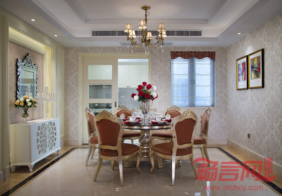 客厅作为家庭成员休息交流的中心,与餐厅相连。同时沙发和座椅选择轻松明快的式样,装饰挂画点缀,辅以挂画同色系地毯更显温馨。餐厅简约的圆形石材铁艺圆桌很好的融合了两种材质,与边上更高的白色小餐柜摆放错落有致,使得空间生动起来。