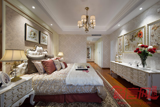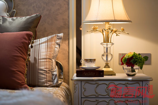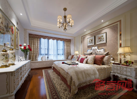 主卧空间,豪华大气,通透实用。融合了三个空间:更衣、睡眠、休息、看书、小坐。简约的欧式家具以硬朗的材质和明快的色调及雅致的配饰,赋予空间沉稳,典雅,轻松的神采。书房简单实用,但软装颇为丰富,各种象征主人爱好的陈设一应俱全,被翻卷边的古旧书籍、地标建筑摆设、一支古典的放大镜……即使是装饰品,这些东西也足以为书房的欧式风格加分。