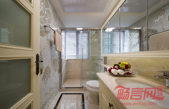 卫生间塑造了概念性的卫浴空间,顶部铝扣板吊顶与墙身艺术马赛、亚细亚世纪石相配,极具休闲风韵,镜面使不大的空间得到延伸也引入了光线。