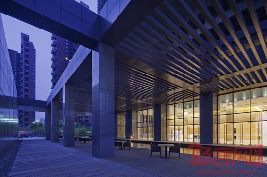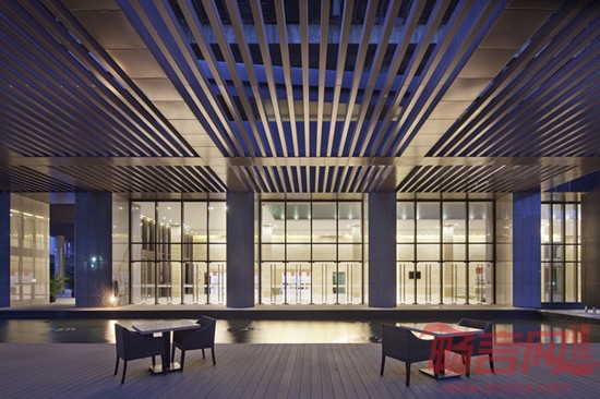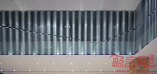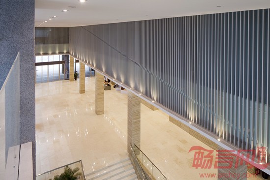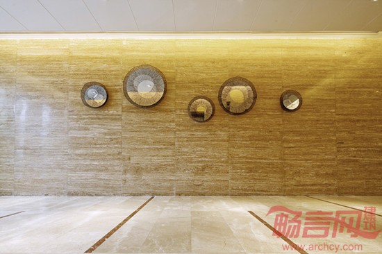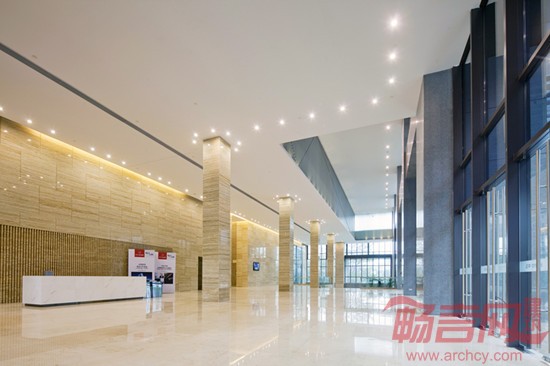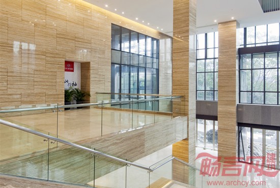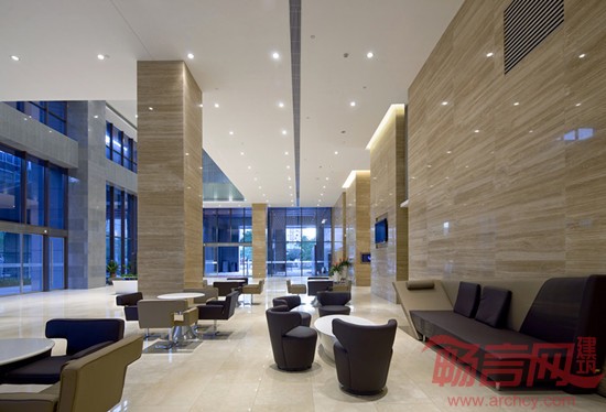 和建筑外观的冷灰色调形成对比,运用了大量的米黄洞石及米黄云石来营造温暖的气氛,调和紧张的工作气氛,让办公人员有进入一个有着融合包裹接纳气氛的环境的感觉,设计过程刻意地减弱常见的文化符号的语言力量,运用单纯而不断重复的节奏来表现空间中现代设计中的精神,那就是简到极致(Minimalism)。调整到纤薄尺度的天花实体减弱对中庭的压迫,立面以铝通排列出转折的隐含线条呼应了建筑的外观,喷砂玻璃令到二层的中庭空间可以共享中庭的光线。独特的原创挂饰增加了空间中灵动的艺术气息。