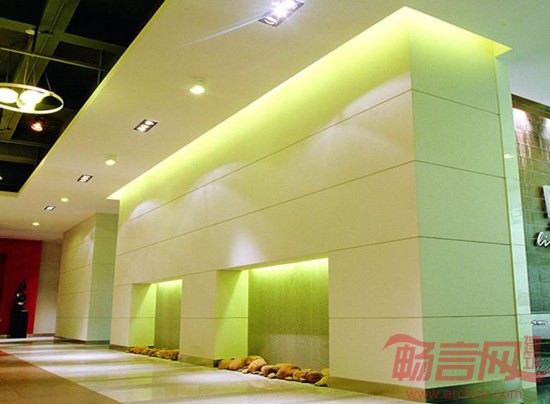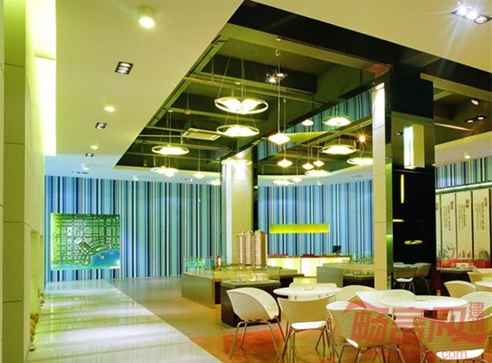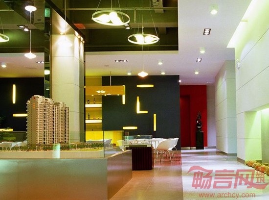 被“商品条码”感觉的防火板所覆盖的弧墙在空间的边缘悄悄地介入到暖色调环境,中心的两根柱子被灰镜所弱化,形成光影交错变化。不规则分布的“鸡腿”吊灯略有幽默感觉。设计想法是想让买楼者在这里有新鲜的乐趣,感染到销售者的热情与活力。