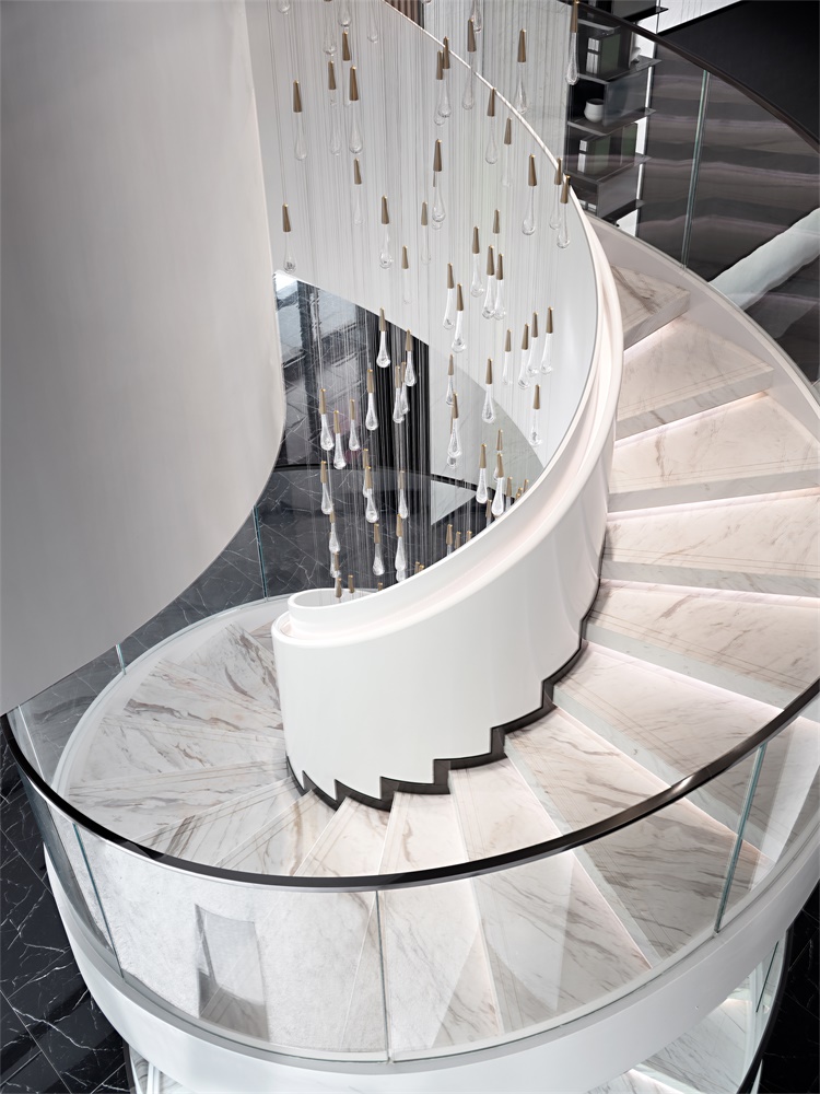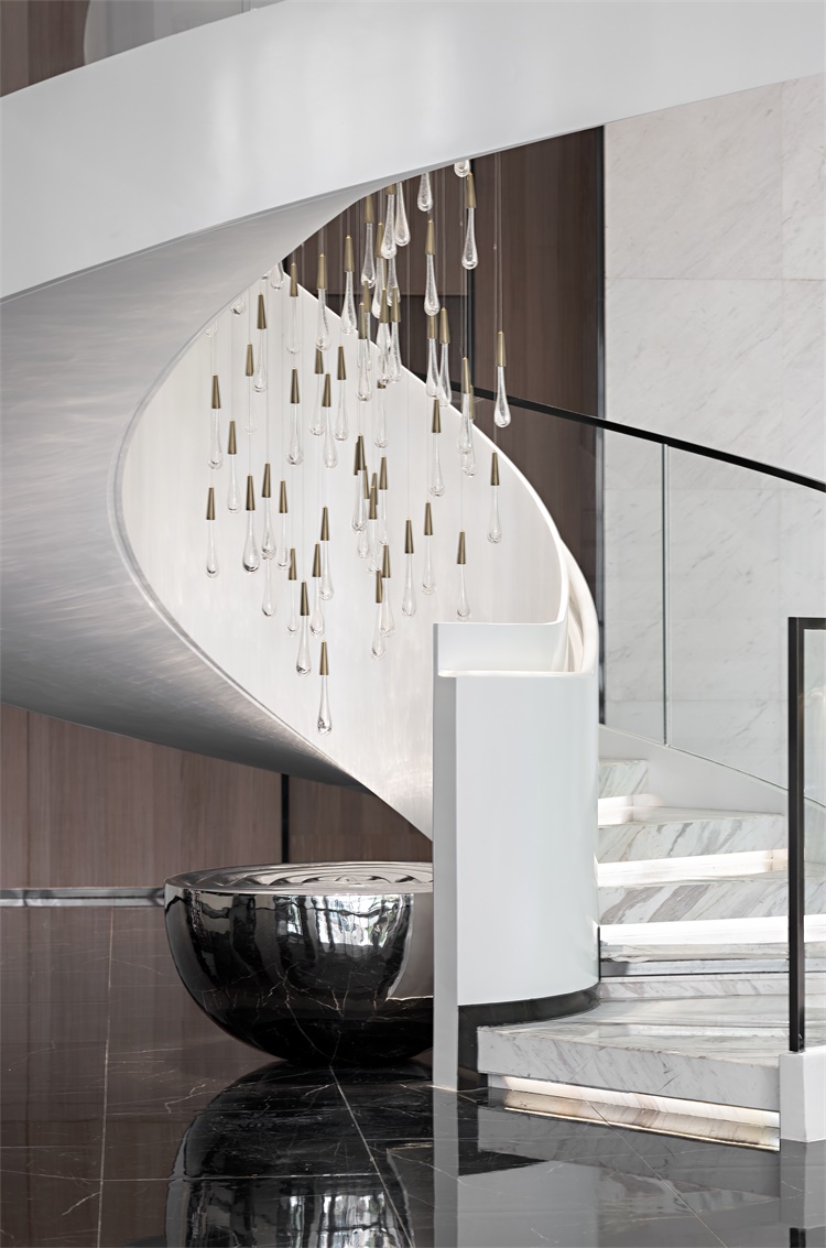 梯间艺术装置“雨滴”,倾泻间如流光溢憬,以近乎凌驾于世俗审美之外的灵动空尽,诉说着光与影的对话,传递着时光的生命轨迹。