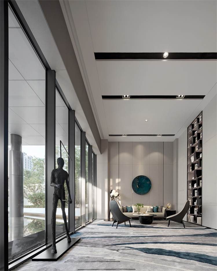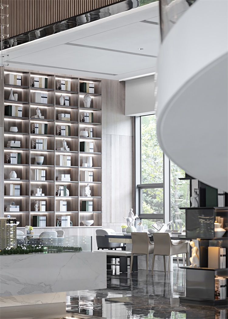 洽谈区以木色贯穿,体块式的书架墙显现书卷气息,在素雅的底色氤氲下,东方的静默文雅与当代简约共融相生。
