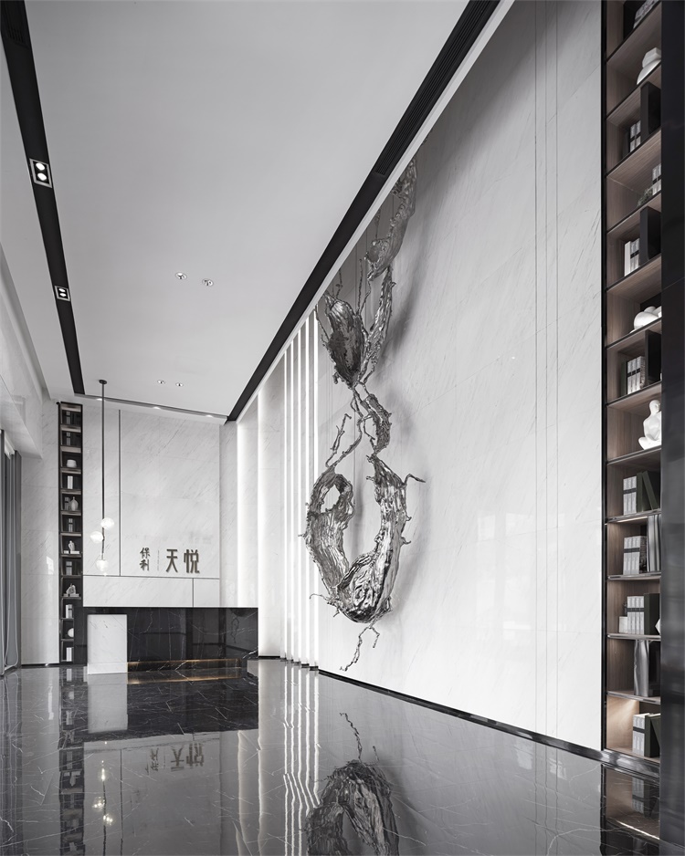 步入前厅,铺陈大面积的爵士白大理石作为空间主色调,干净而通透的玻璃幕墙,将自然与光线似有似无置于交互之间。悬挂正中的艺术装置“烟雾水墨”如烟尘绕阿绕的,像霓裳羽衣的袖,曼织长带,千丝万缕在玉臂的香气里挥洒着如密密的网,缭绕住整个空间情感,始之奔腾 绵绵收罗。