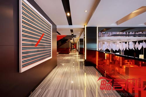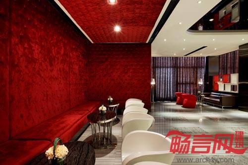 舞动的红色是热情与活力的象征。红色的玻璃楼梯扶手,红色的洽谈区软包墙体,红色的家具,是青春燃烧的火焰。在深色木饰面及黑镜钢的陪衬中,红色以极富动感的姿态连续出现,像一条红色的飘带一样贯穿着空间的各个领域。