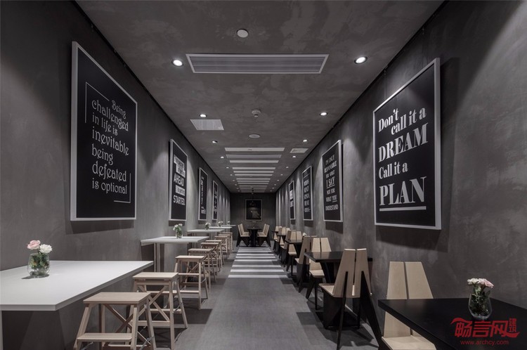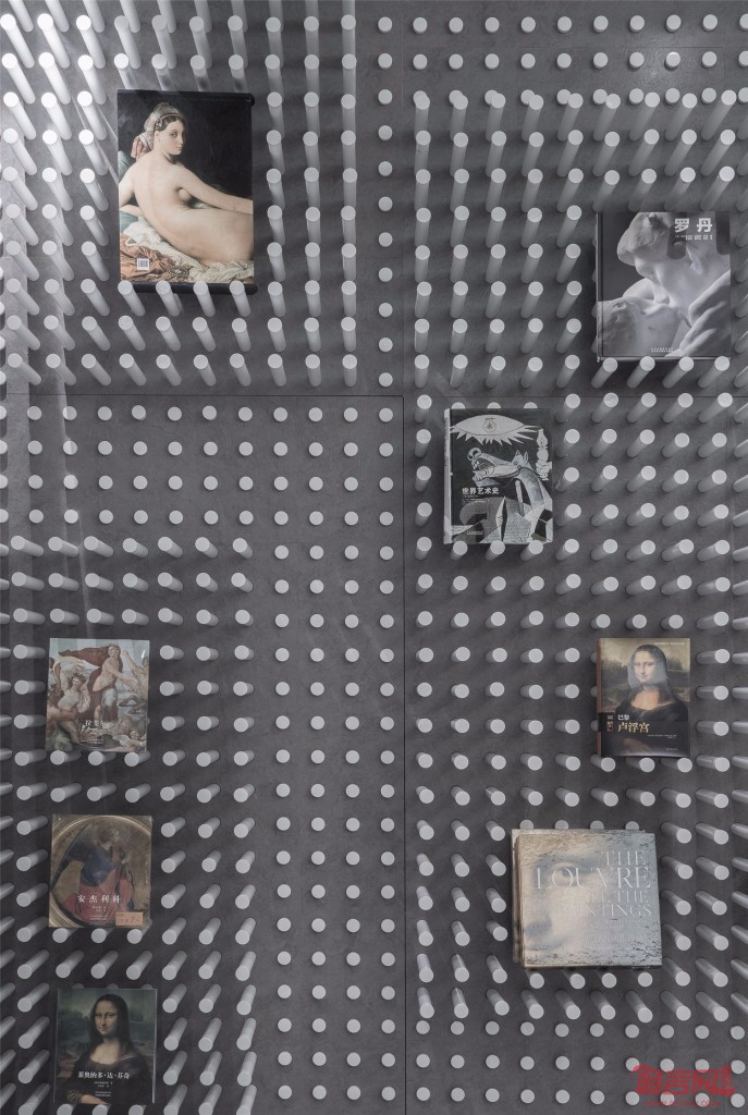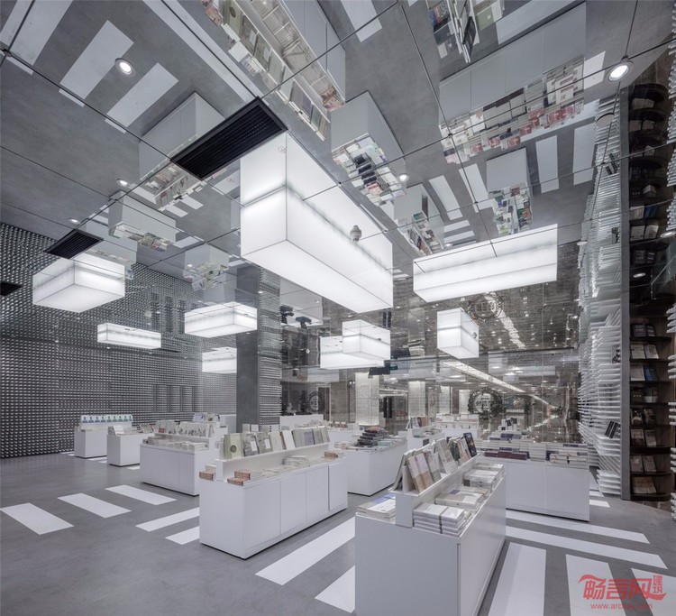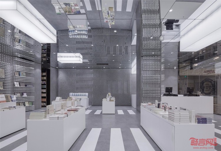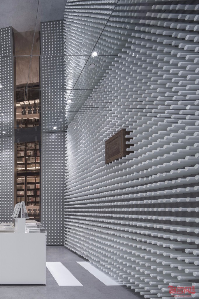 乘坐电梯来到四楼并向深处看去,可能就会看到钟书阁的字幕玻璃幕墙,隐约可见其中干净整洁灰白色调和谐晕染,安静的光晕透过字幕幕墙的空隙传递出来。走近,走进。你便知道这次钟书阁要讲的与书的故事和斑马线有关。这正是这家钟书阁要表达的情怀,也是上海这座繁忙的城市的缩影。素色的混凝土映射着城市的马路颜色,白色摆书台横竖有致静立路面,链接每个书台的地面画着一条条白色的人行横道线条,明确指引着书台与书台间的路径。满墙阵列的白色圆管,每一根都可以自由伸缩进墙体,通过这样的机动性可以塑造不同样式的阵列图形,这种变换的形式亦是摆放书的架台,同时更映射了快速变换的社会现状。在这里读者俨然进入到了一个城市空间,但是这里没有车水马龙,只有安安静静的路与斑马线,还有在书台上落成山的书。因为斑马线好比那一本本伴随我们成长的书籍。在对的时间,遇到对的指引。由此来表达书与读者的精神关联。
