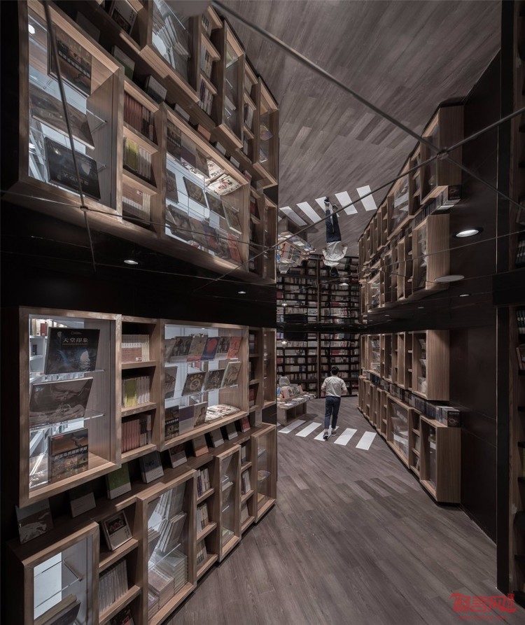 穿越这安静的图书公园便来到了书籍的天空之城,一条蜿蜒的路径贯穿4幢由书架构筑成如建筑般的书架,让读者体验穿越在真正的书的城池,在路径上看在这里每一间“房子”外的墙都是书架构成,而且留有大面积的可透视窗口,可以看见“房子”内的情景,但从房子内部看则是一个个文化艺术主题和相应的书籍馆。4间建筑内面积有大有小,小型的犹如一个安静的书房,大的可以容纳小型的读书会。这里用书籍构建城市的模样,与外界喧嚣的街区不同,这里只有安静的读者与作者之间的隔空交流与感悟的精神世界。书架之间的路径宽窄渐变,曲径蜿蜒间可见地面标示的斑马路线,这里,恍惚间像是走在上海的百年街道感受浪漫与上海的情怀。