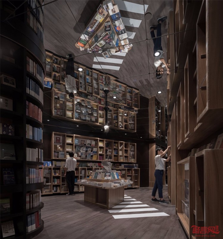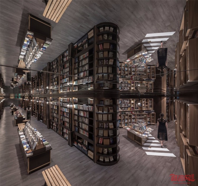 接承这个空间的是一个休闲阅读的长廊,这里有一排长长的公园椅子,书架设在两厢,书墙每隔一段就会有一盏路灯。这里不仅是读书长廊,更是一个室内读书公园。慢慢行走在书的世界,累了,坐在路灯下的椅子上,静静安放精神在一本心爱的书上,正是这个空间想给予读者的阅读环境。