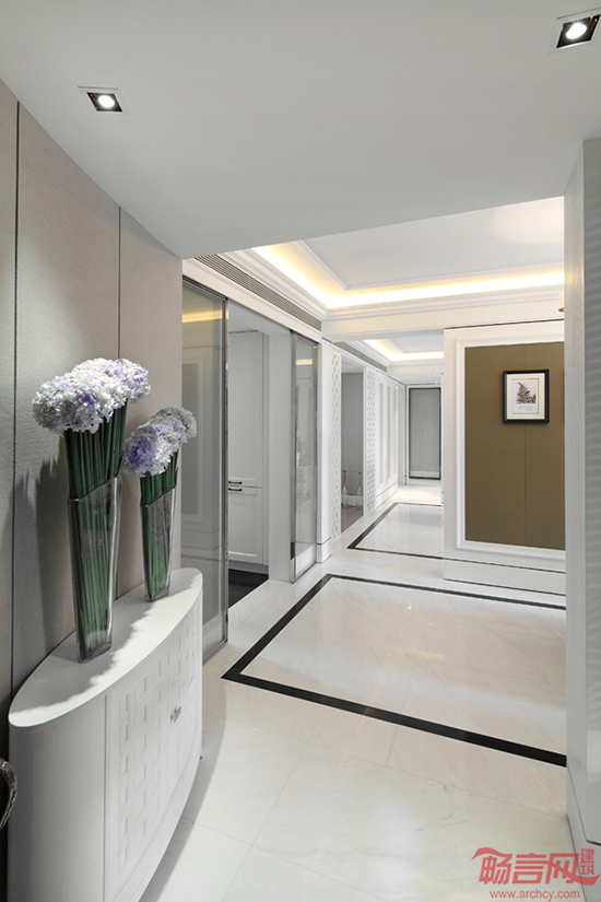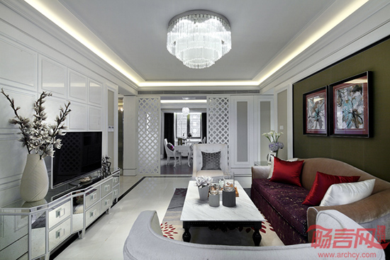 本案整体采用纯白色调和简约流畅的线条,干净利落又不失优雅品味。空间构造巧妙合理,强调空间变化的连续性和形体变化的层次感,形成了完美的构图效果,亮色调饰品点缀于白色基底色之上,形成较大对比度,时尚烂漫。同时,大量运用欧洲古典元素的软装配饰,复古家具、印花地毯、薄纱窗帘等配饰营造了一种古朴的欧洲风情,与现代简约完美配合,一气呵成、韵味十足。