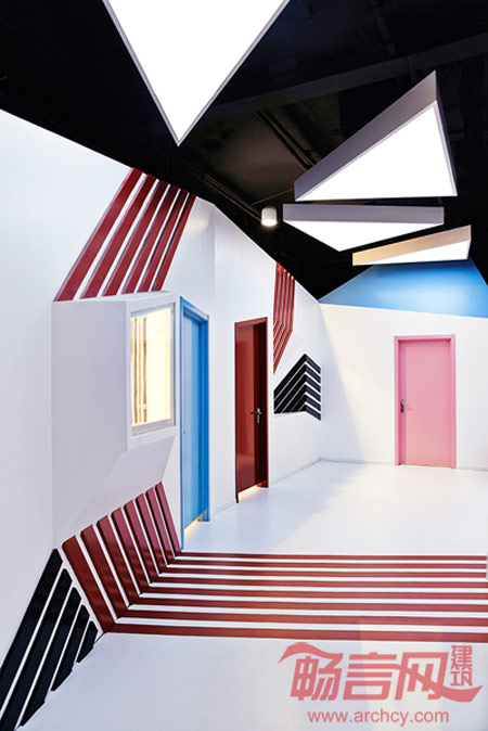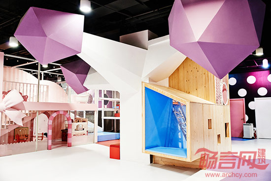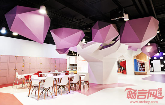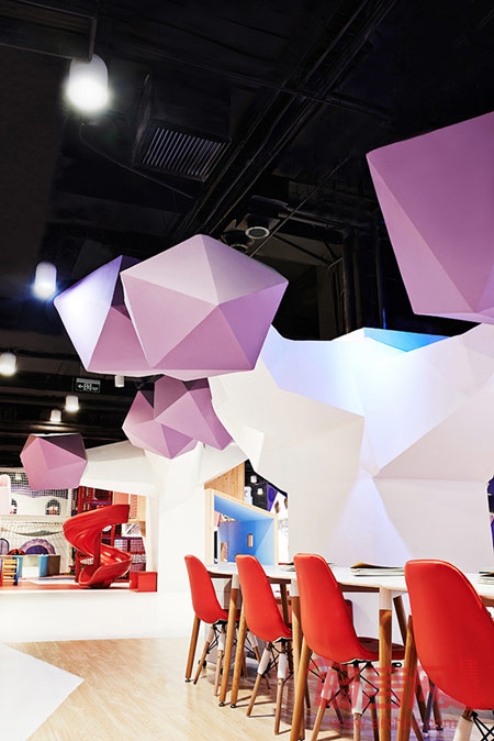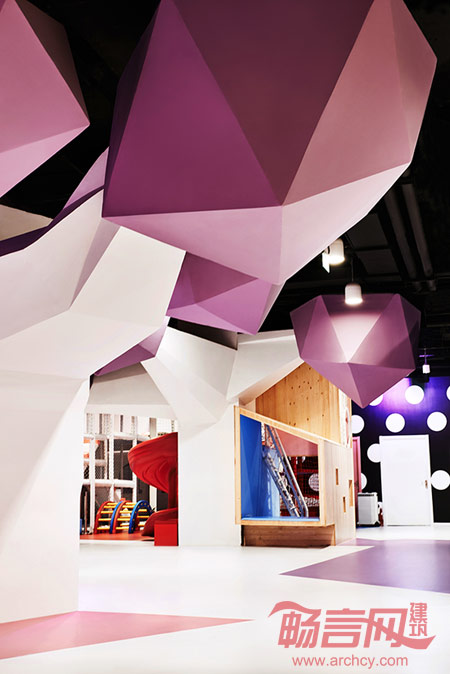 度态建筑的设计师不认为室内儿童乐园只能一味的模仿自然环境。米蒂跳乐园采取了Low-Poly(低分辨率多边形)的设计主题,把常见的儿童游乐造型主题抽象成几何体,明确的表达出室内人工环境与室外自然环境的差异。