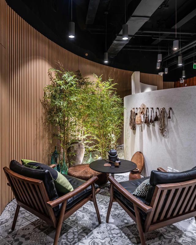 图案细密的花砖和水磨石地面,仿佛由研碎的多种香料铺就的茶马古道;竹木栅格赋予墙面和谐的韵律;青砖和赭瓦装饰的饮品吧台则成为接待前区的娓娓回音,浓烈的“蓉城故事”在这里续写。吧台上茶壶与咖啡壶并排摆放,壶与壶之间是文化的交流、味蕾的碰撞。殊途同归的,是对优雅生活艺术的追求。
