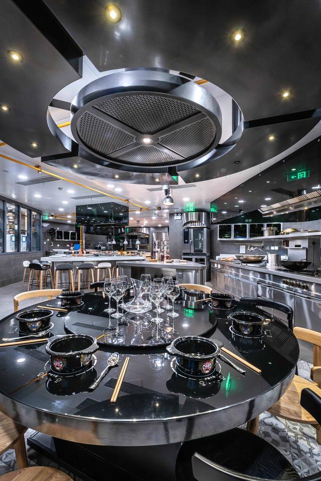 穿过宁谧的“城市客厅”,便来到颇具科技感和未来感的“超级厨房”,这是融合创新佳肴诞生的秘密基地。全功能的中西厨既包括烘焙、烧烤,又包括炖煮、爆炒和火锅,设计又需考虑通风、燃气,以及生熟食物、食品垃圾和厨师、体验人群的动线流畅。