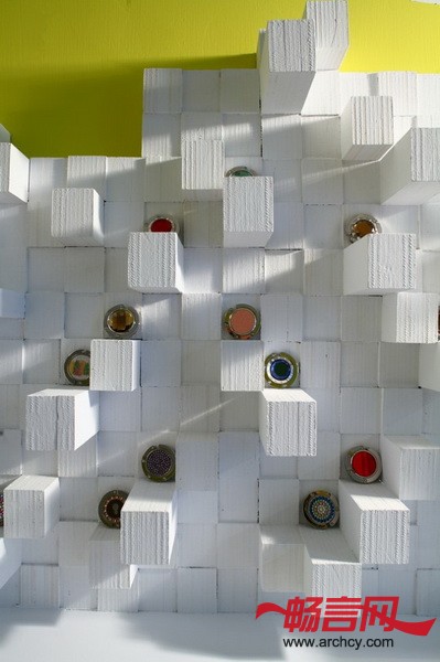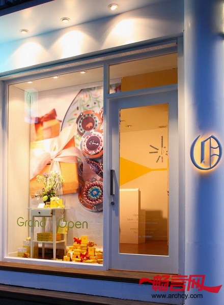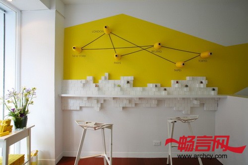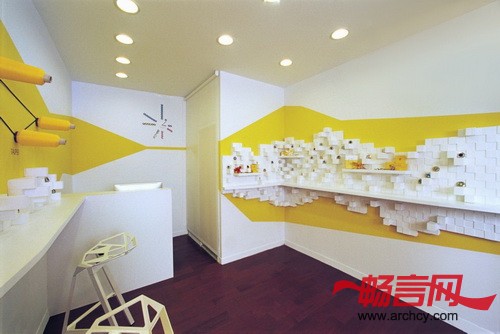 台北的OPUS位于城市的时尚区。这里曾经是一个汽车修理厂,后来在经济衰退期被改造成一个小店面。这个小店仅有2.3米宽,4.5米长,约计10.5平方米,是一个非常小巧的空间。为了克服店面过于狭小的困难,我们采用了透视错觉设计:在白色的墙上喷涂黄色(OPUS签章颜色),从而创造了一个更深入和更广阔的空间印象。具有节奏感的黄色块沿着两面对立的墙面延伸,并在后墙上合并成一条水平线。在这条水平线上面,醒目地悬挂着特别设计的钟表。这个不同寻常的钟表像是初升的太阳:由OPUS钱包扣组成的线条代替了数字来表示钟面上的时间刻度。4种不同颜色的OPUS收藏的经典施华洛世奇钱包扣拼成了表盘上的区间,每一个区间包括3个小时。蓝、紫、粉和绿这四种颜色从冷色过渡到暖色,反映着一天的光线变化。这个钟表同时是一副风俗画,是店面之星,引起了众多人们的兴趣并对其进行评论。