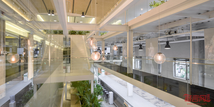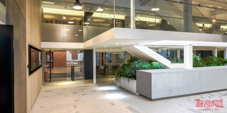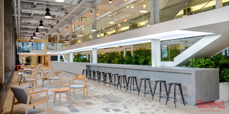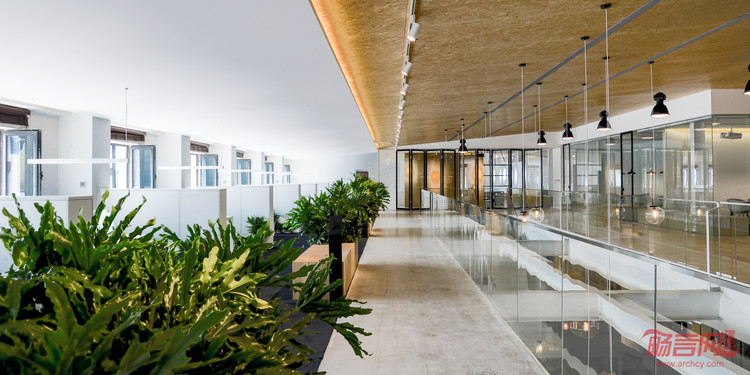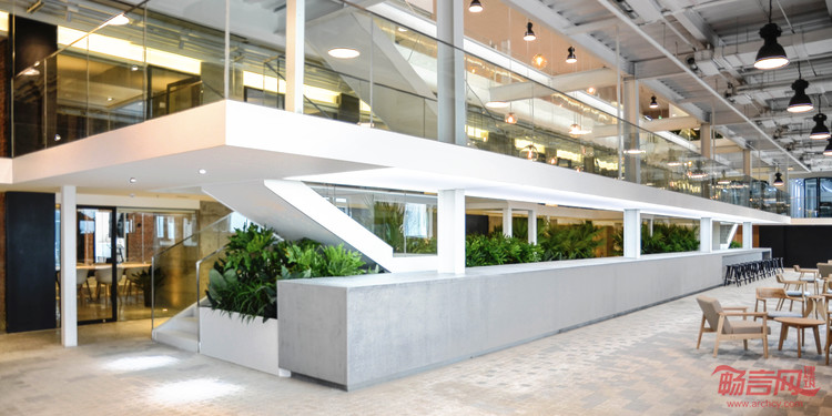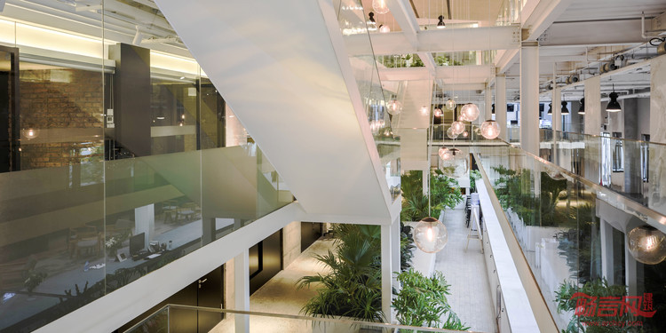 桥梁般的阶梯同时为动线的一个部分,其穿过中庭的挑高处并彰显了接待吧台的效果。而中庭的部分也作为植栽生长的区域,与周遭白色结构的组合创造出有趣空间氛围。