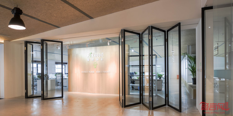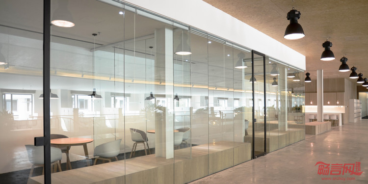 每层的规划皆以中庭为中心,其规律的围绕着会议室,导师室和办公区域。在材料的部分,从一层到最上层的选材则是带有层次的:一层的区域使用了质地粗糙的灰色石头,设计成不同的形状与大小排列形成象素的效果。顶层的空间基本使用木材为主要材料,其天花的部分则是使用集合板材覆盖。