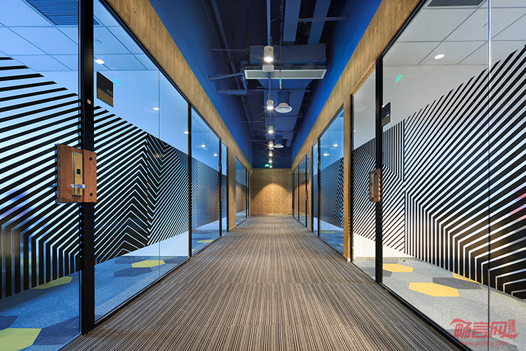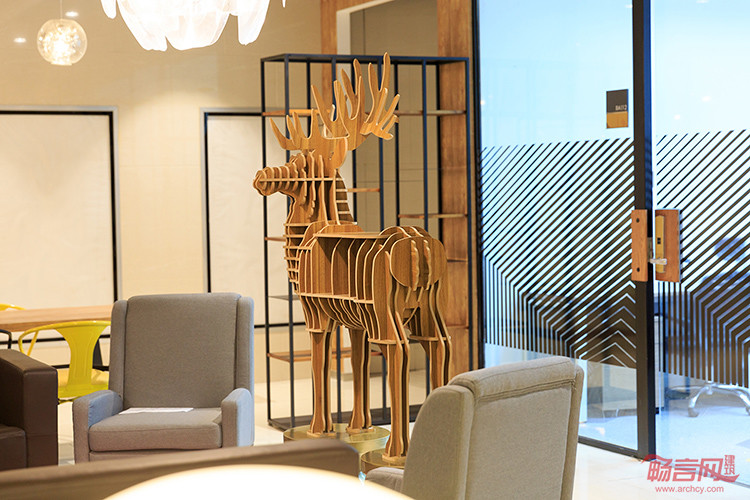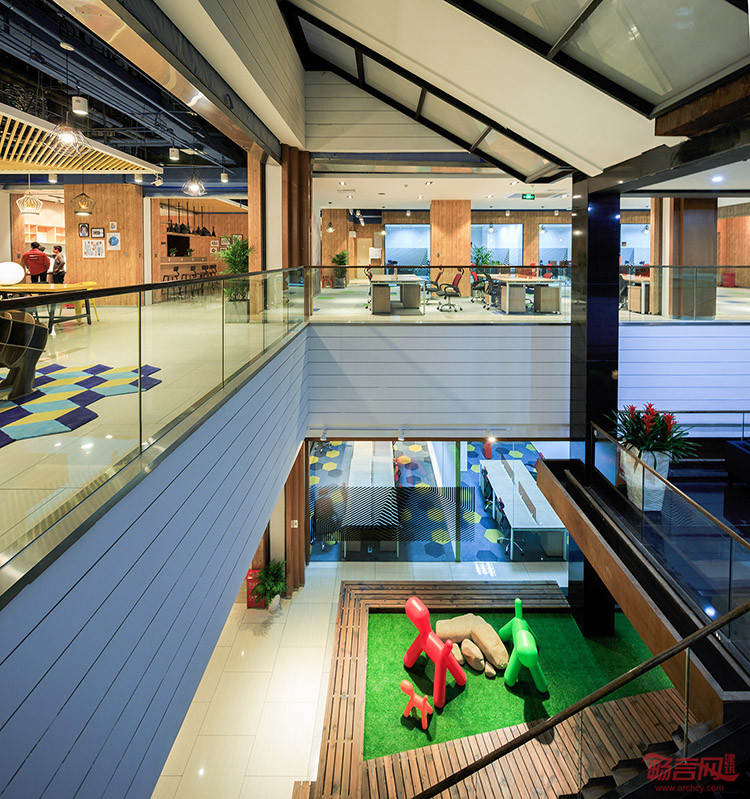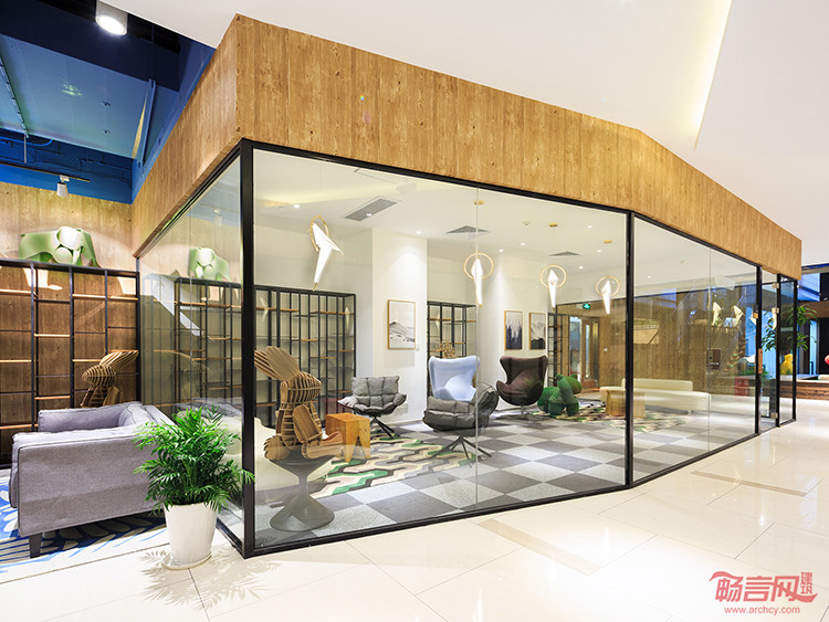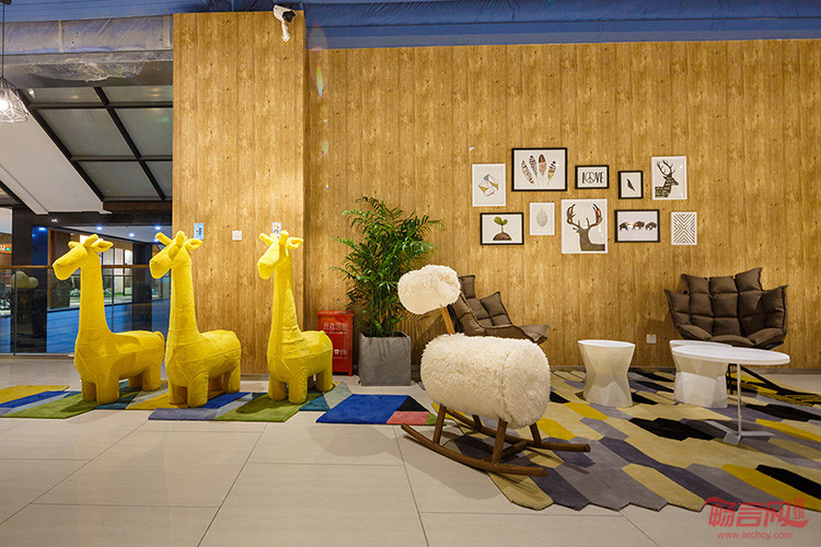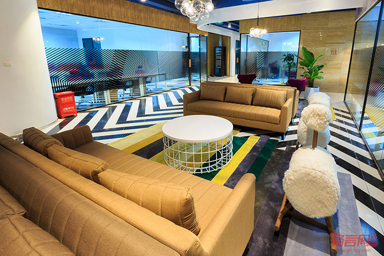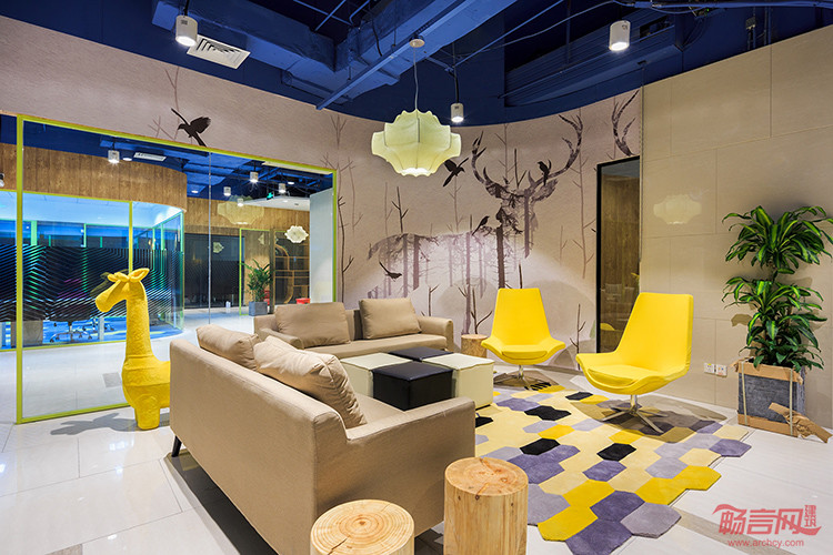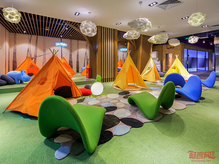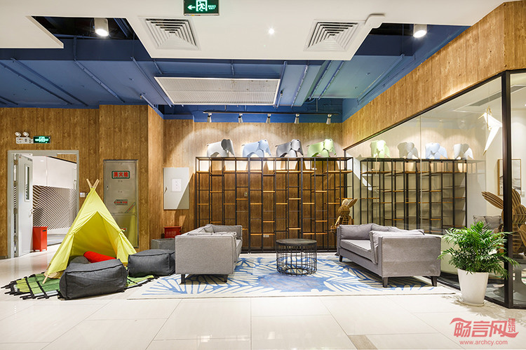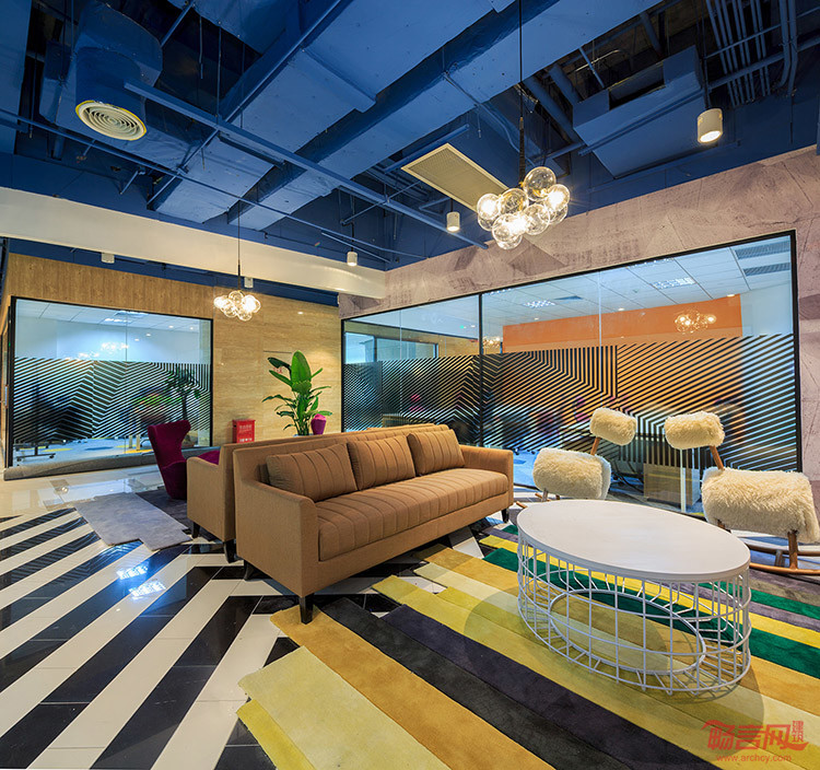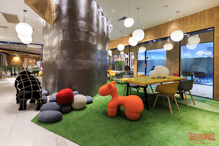活力空间带从B1F入口起贯穿整层室外空间直至喜马拉雅建筑中心的艺术中庭。仿佛如一条裹挟着奔腾江水的峡谷横贯山脉。其中活力空间带中的公共空间节点包括:入口企业展示区、周末超市、艺术长廊、公共休息区、淘吧绘本馆、水吧咖啡区、沙龙活动路演区、酒吧等,如游乐场一样的办公空间。跃动的明黄,静默的新绿,热情的橙红,色调的搭配打破了普通办公室的冷静与墨守成规,增添几分互联网时代创业者的写意与激情。沙发的圆,桌子的方,再点缀几处不规则的图形,让这个空间多了几分活力的趣味。