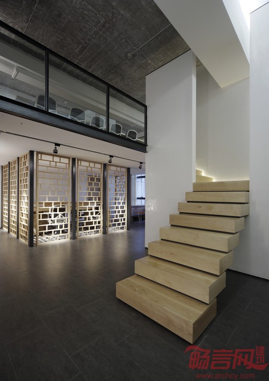 茶室两侧的墙壁采用了麻布材料,以营造出自然的氛围。定制的茶桌椅脚采用细钢组成的块体,轻盈而现代,营造出一种悬浮的假象。为了保证巨大落地窗的带来的景观视线不受阻碍,阁楼区域没有扩展到与玻璃的交接处,而是与玻璃之间有一段合理的距离。观者走到窗户边往上看,便可以发现这个不经意的角落又藏有一景,通过木格栅,可以隐约看到二楼的会议室。这种似分非分,似合非合可谓是设计师特意制造的一种假象,然而,柳暗花明又一村,即便颠覆常规的想象,但生活本身就应该处处有惊喜,何乐而不为呢?