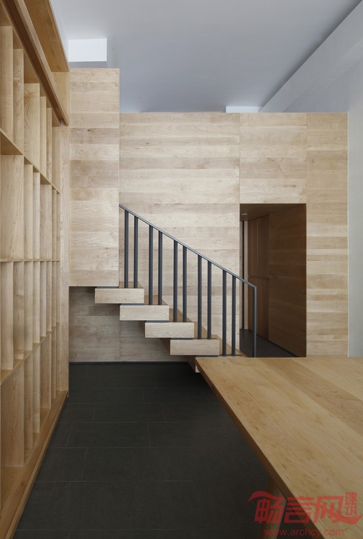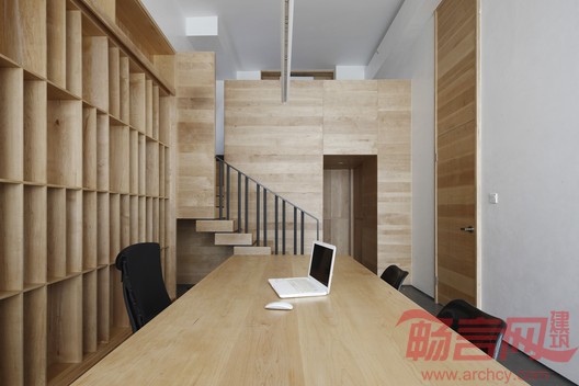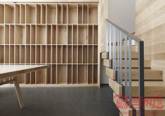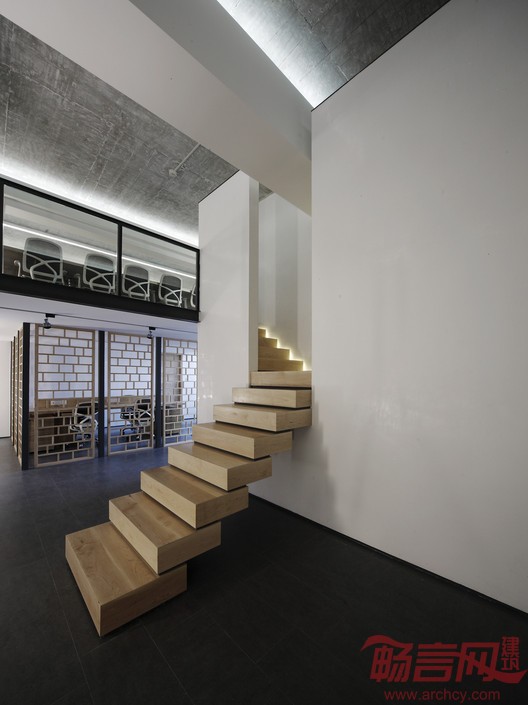 门厅右侧的吧台采用灰色人造石设计而成,时尚简洁,酷味十足。打开壁柜,咖啡机、微波炉等厨具应有尽有,可满足员工准备午餐、下午茶甚至举办小型聚会的需求。进入右侧尽头的总经理办公室,收获的则是满眼的木色。储藏室的过道如同洞窟般,由于面宽不大,设计师采用了切割体块的方式,左侧的木板如同由整体木块切割移出,经由楼梯可抵达阁楼休息区。这种既分离又连结的空间某种程度上呈现出一种庄严的场域感,又为观者提供了更多的体验尺度。门上延长的木板令门成为空白墙上的一道个性风景。