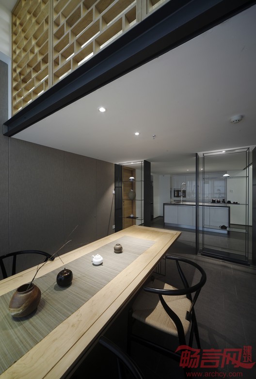 为了提升空间的立体感,门厅没有设置照明设备,唯有从远处墙壁的灯柱迎来的淡淡白光,令观者一进门即在这份宁静中得到放松。阁楼采用宫字格这种传统的文化图腾,又如砖砌方式,丰富了空间的表情。为了保证安全性,宫字格格栅设定了足够的厚度,当阁楼灯光亮起时,光线穿过厚厚的格子映射在高墙上,流溢出现代而温馨的空间气质。由此将观者带到熟悉的记忆时光:是那奇峰石景“一线天”,又或古老巷弄中的阳光斜影,岁月几许。