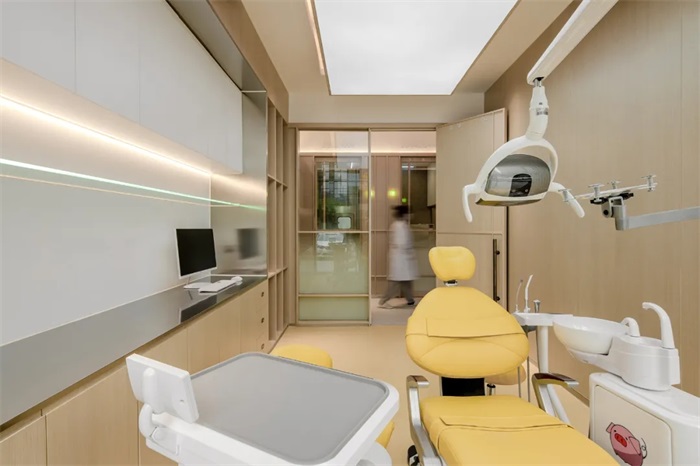 在口腔诊所的环境中,访客的不安和焦虑感时常存在,所处空间的材料和色彩对于营造轻松舒适的氛围则是至关重要的一环。考虑到访客的年龄跨度,整个空间选用了大面积的原木色木饰面,天然的材料让原本机械和卫生的环境,增添了轻盈感和舒适感。