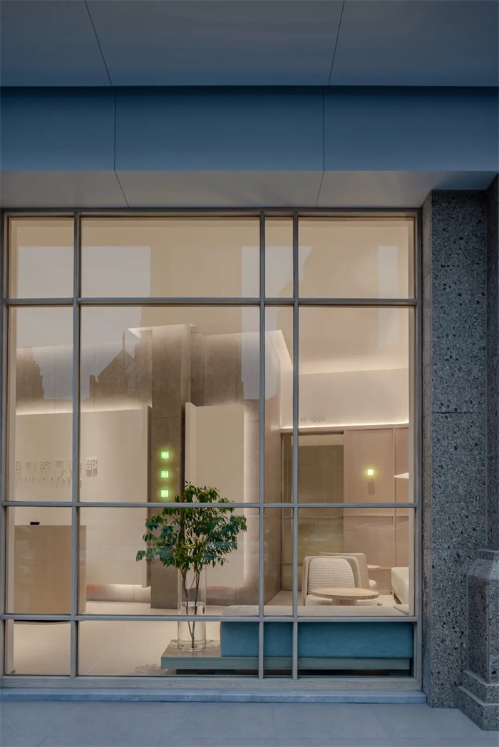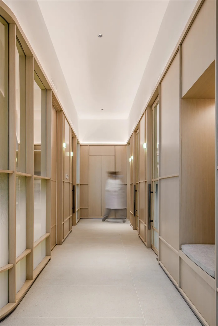 透过玻璃可以看到,每间诊室的墙面都有一条干净利落的绿光,这其实是由一块透明玻璃板,利用玻璃本身的厚度和绿色成分,再通过灯带,折射出绿色的光感,体现了科技感的同时,这一道“绿光”也贯通整个环境,让空间更有生命力和自然放松的感觉。